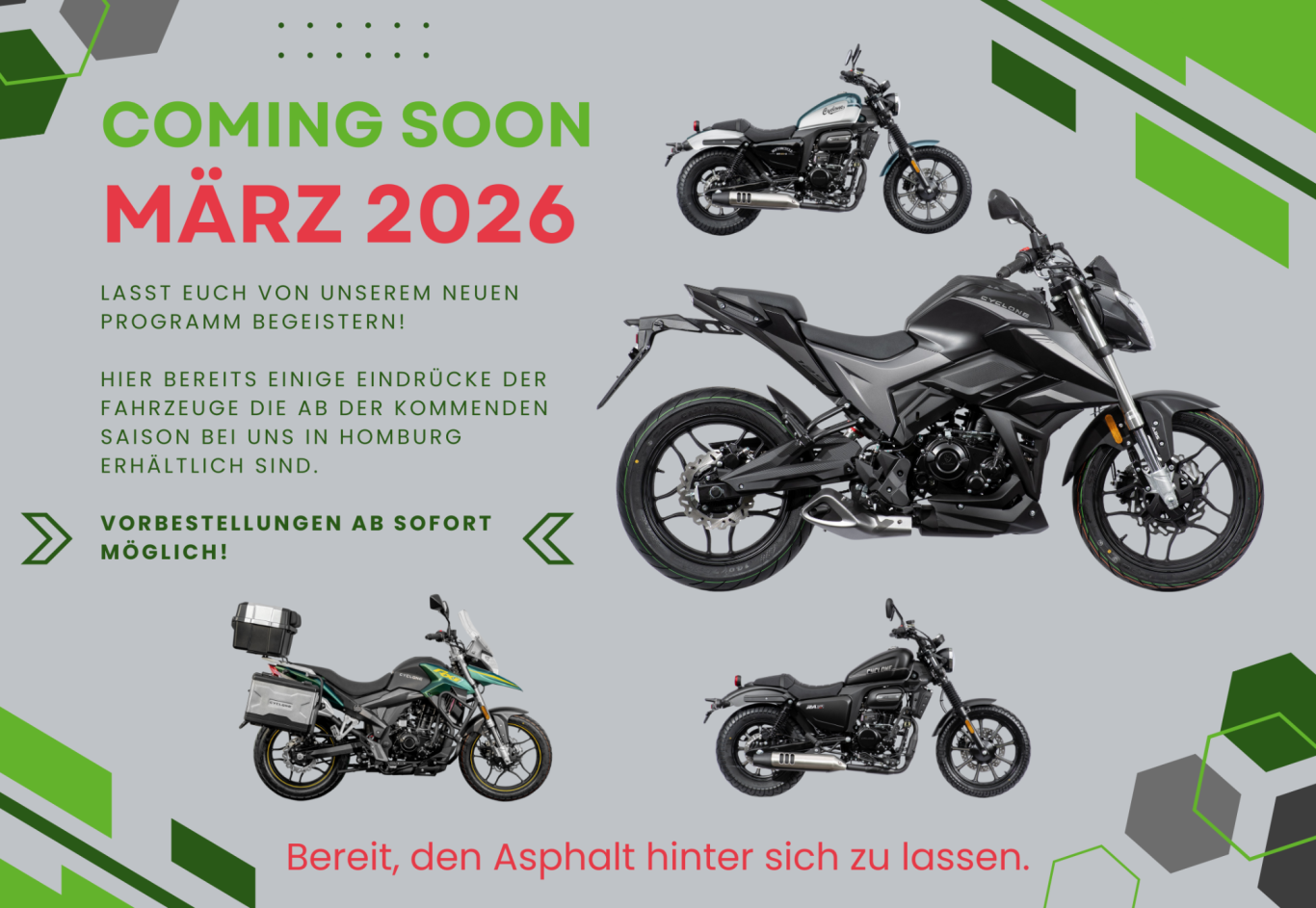 Egal, ob Sie 16 oder 116 Jahre jung sind – bei uns findet jeder das perfekte Gefährt, um die Freiheit auf zwei Rädern zu genießen! Von spritzigen 50ccm Rollern, die perfekt für den Stadtverkehr sind, bis hin zu kraftvollen 350ccm Maschinen für die Abenteuerlustigen unter Ihnen – wir haben für jeden Geschmack und jedes Bedürfnis das passende Modell.